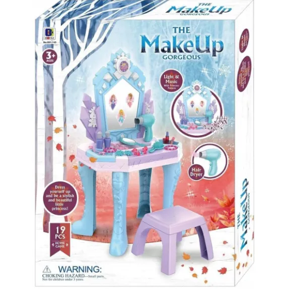 Setul conține tot ce este necesar pentru joaca de-a salonul de frumusețe: măsuță cu oglindă, scăunel și accesorii de machiaj.