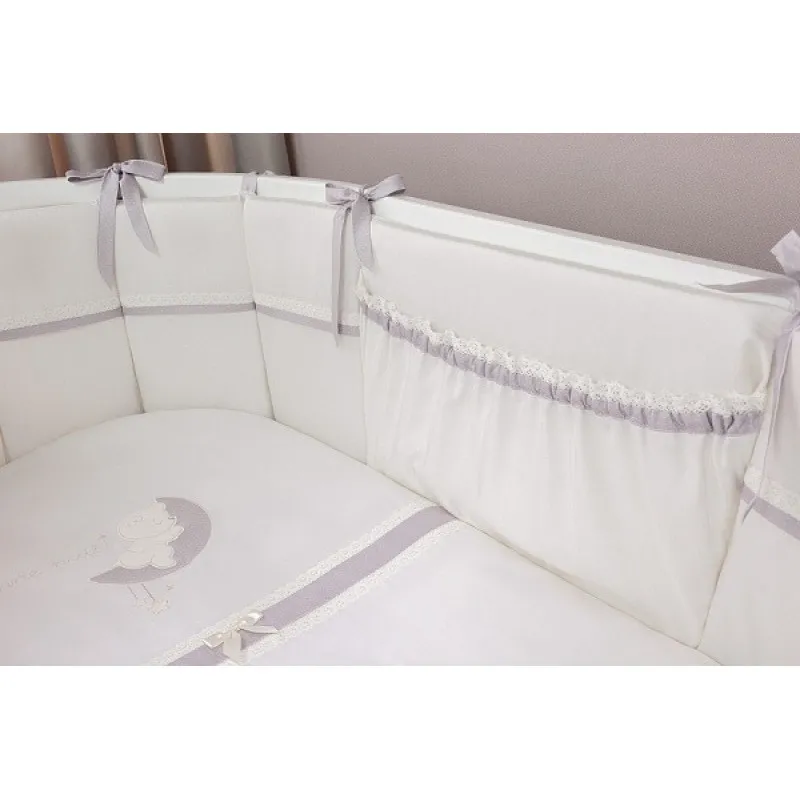Setul este gândit până la cele mai mici detalii: forma specială a pernei și pătura cu colțurile rotunjite creează o compoziție integrală. Peretele protector permite diferite combinații și este potrivit atât pentru paturi rotunde cât și ovale, iar funcționalitatea buzunarului suplimentar a fost deja apreciată de mulți părinți.