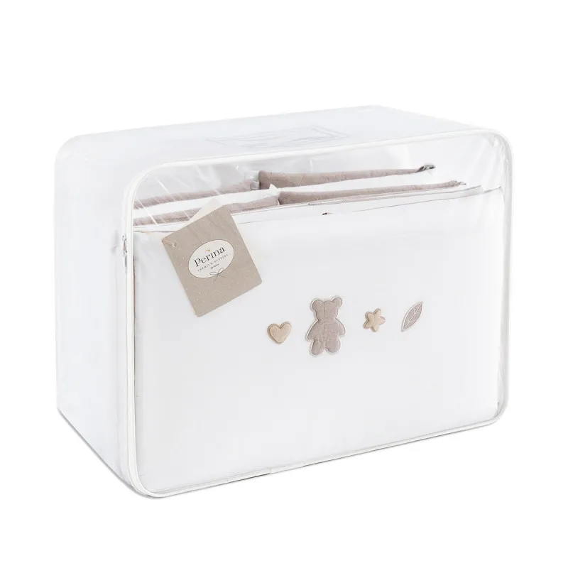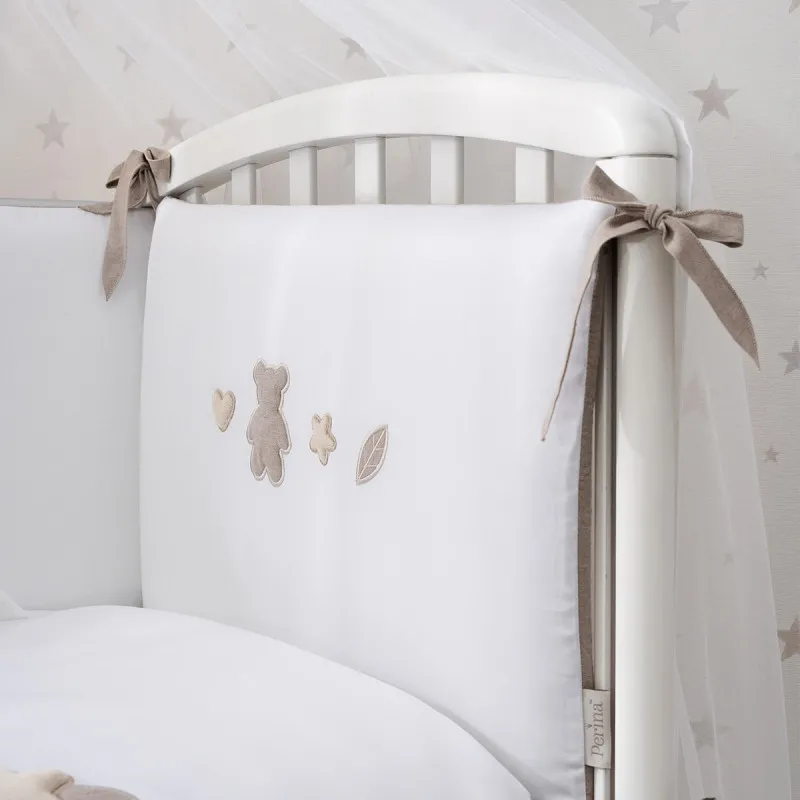 Culoarea principală a modelului "Teddy Love" este albul, care creează o stare de spirit aerisită și nu va distrage atenția copilului înainte de a merge la culcare. Dar nici nu te vei plictisi, pentru că sunt realizate aplicații voluminoase de urs natural pe husa plapumă si părțile laterale. Verificat: nu interferează deloc cu somnul, dar după trezire, copilul va fi interesat să le examineze și să le atingă.