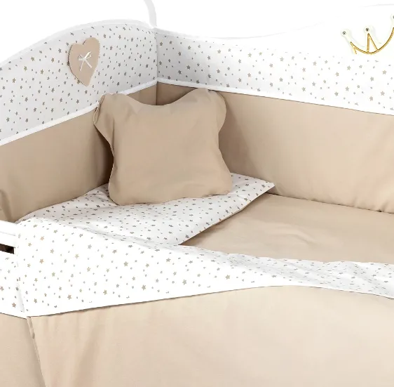 Cearsaf de pat: 120x60 cm (1 buc.), Cearsaf de plapumă: 120x90 cm (1 buc.), Fată de pernă ortopedică: 30x25 cm (1 buc.), Fată de pernă pentru copil: 50x30 cm (1 buc.), Plapumă: 120x90 cm (1 buc.), Pernă ortopedică: 30x25 cm (1 buc.), Pernă pentru copil: 50x30 cm (1 buc.), Aparatori: 60x35 cm (6 buc.)