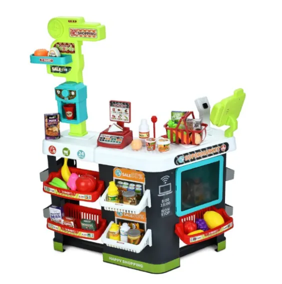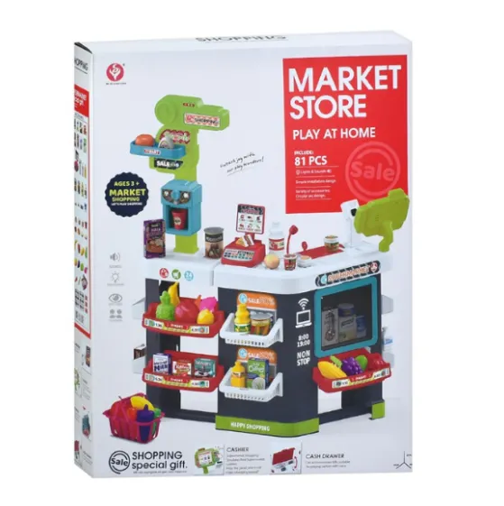 Setul de joacă pentru copii „Magazin cu rafturi” este o jucărie realistă pentru copii care iubesc jocurile de rol. Setul include un raft mare de 87 cm înălțime, cu polițe, casă de marcat și scaner care emite semnale luminoase și sonore în timpul „cumpărăturilor”. Setul conține în total 81 de piese: produse din plastic, ambalaje, bani, coș și accesorii. Există un compartiment separat pentru frigider și casa de marcat cu sertar pentru bancnote. Datorită numărului mare de elemente, copilul poate aranja propriul magazin, poate juca cu prietenii sau cu părinții, dezvoltând logica, vorbirea, imaginația și motricitatea fină.