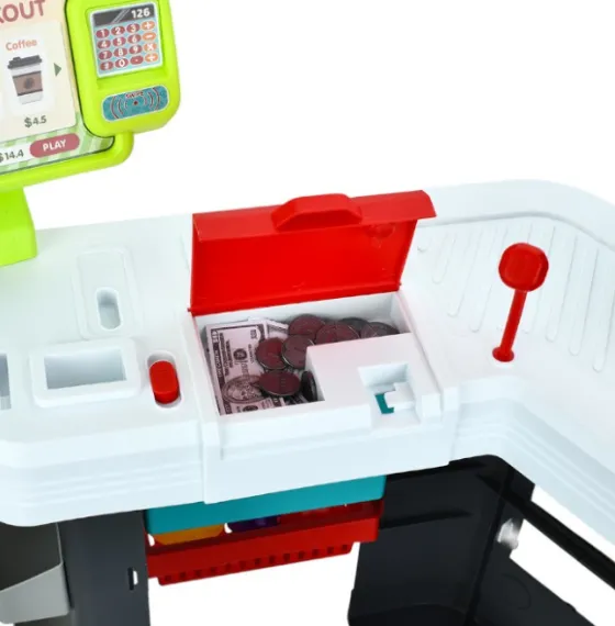 • Conținut: raft, casă de marcat, scaner, produse din plastic, bani, coș, accesorii (81 piese)