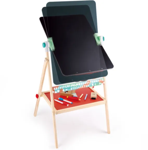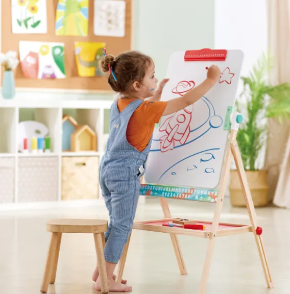 Un șevalet cu două fețe de la HAPE, unde copiii pot desena, picta sau pur și simplu își pot lăsa imaginația să zboare! Pur și simpluîntoarceți pentru a alege o parte a tablei sau atașați o bucată de hârtie pe care să desenați. Suportul de hârtie fixează diferite dimensiuni de hârtie!