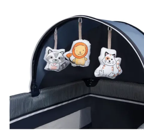 Pătuțul are 2 înălțimi de saltea, precum și o intrare laterală cu fermoar și pereți din plasă ventilați pentru a asigura o circulație adecvată a aerului.