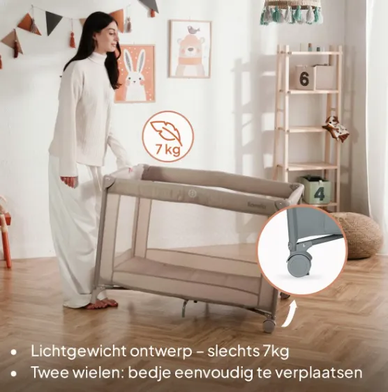Lionelo Amelie este un pătuț 3 în 1 compact și practic, ideal pentru utilizarea zilnică acasă sau în deplasare. Dimensiunile sale reduse și greutatea de doar 7 kg îl fac perfect pentru spații mici și ușor de transportat.