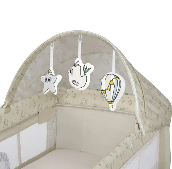 Perfect pentru utilizare acasă, pe terasă sau în grădină. Copertina funcțională (cu 3 jucării captivante) protejează copilul de razele soarelui și reduce supra-stimularea, în timp ce plasa de țânțari inclusă oferă protecție împotriva insectelor. Astfel, pătuțul/țarcul poate fi folosit și în aer liber, ori de câte ori temperatura este potrivită.