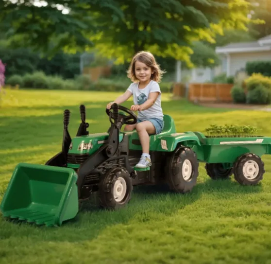 Acest tractor încărcător funcționează cu pedale, permițând copilului să se deplaseze independent și să își dezvolte coordonarea și forța musculară într-un mod natural și distractiv.