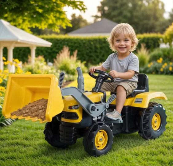Tractorul încărcător cu pedale este un vehicul mare pentru copii, conceput pentru joacă activă și explorare. Designul realist, cu cupă frontală mobilă, permite copiilor să transporte nisip, pământ sau jucării, stimulând imaginația și jocul de rol.