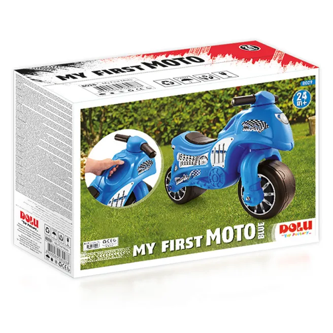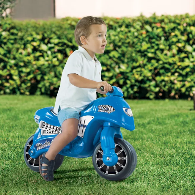 Motocicleta este decorată cu autocolante în stil sport în albastru și este fabricată din plastic rezistent la impact și rezistent la decolorare. Această jucărie este destinată copiilor cu vârsta de peste 2 ani, este fabricată sub forma unei motociclete albastre.