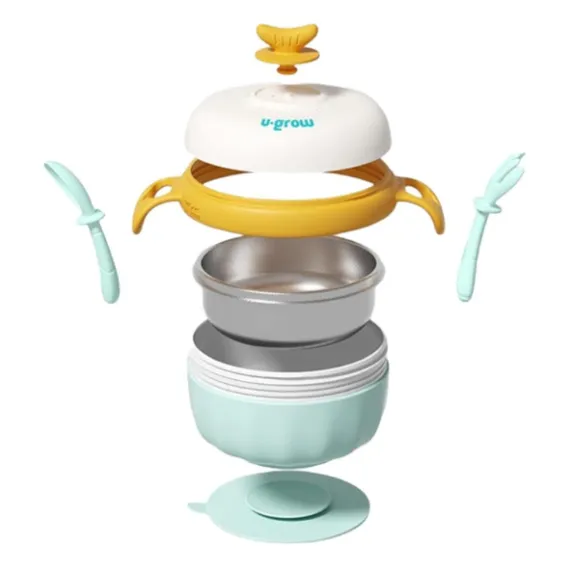 Pentru menținerea temperaturii, în compartimentul exterior din polipropilenă se adaugă apă fierbinte sau rece. Bolul interior este fabricat din inox. În pachet sunt incluse și o linguriță și o furculiță pentru copii.