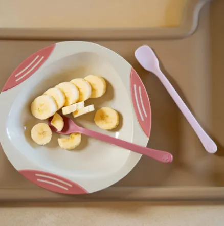 Lingurița pentru prima hrănire de la AKUKU este puțin adâncă, îngustă și fermă, ceea ce o face ideală pentru începutul diversificării alimentației. Mânerul lung și confortabil permite părinților să ia cu ușurință mâncarea din borcan și să hrănească copilul. Lingurița are o formă unică, asemănătoare cu o spatulă logopedică, ceea ce facilitează copilului să ia mâncarea de pe ea.