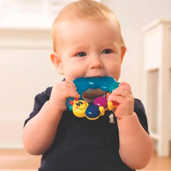 Formă amuzantă și culori strălucitoare: Mestecătorul are forma unei omizi, cu culori strălucitoare și textură plăcută, ceea ce îl face distractiv pentru bebeluș.