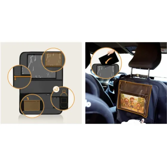 5 buzunare versatile. Un buzunar mare cu fermoar, două buzunare mai mici pentru sticle sau gustări, un buzunar mic practic și un buzunar pentru tabletă ajută la menținerea ordinii în mașină și la păstrarea tuturor lucrurilor la îndemână.