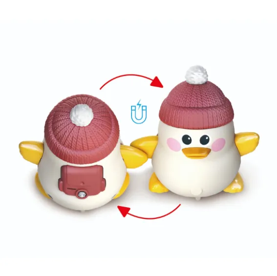 Setul include o rață mare și două rațuște mici. Mama rață mare poate merge alături de cele două rațuște mici, încurajând copilul să le urmeze și să interacționeze cu ele. La apăsarea butonului, jucăriile mici se pot roti, atrăgând atenția copilului și stimulând curiozitatea acestuia. Mama rață mare cântă 8 melodii vesele pentru copii, iar steaua de pe pieptul ei se aprinde, stimulând dezvoltarea vizuală (volumul poate fi reglat).