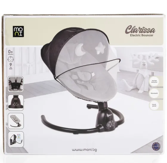 Leagănul electric Clarissa are un design elegant și curat, potrivit pentru orice interior. Are 5 viteze de legănare din care puteți alege. Leagănul are un senzor de mișcare încorporat, care poate activa automat legănarea atunci când copilul se mișcă. Cu ajutorul funcției Bluetooth, puteți reda muzică la alegere, în cazul în care nu doriți să utilizați cele 10 melodii disponibile. Leagănul funcționează doar cu un adaptor cu un cablu de 5m (inclus în set). Poate fi controlat fie prin panoul tactil al mecanismului, fie printr-o telecomandă. Opțional, puteți utiliza și temporizatorul cu opțiuni de 8, 15 și 30 de minute. Selectând una dintre aceste opțiuni, leagănul se oprește după intervalul specificat de timp. Centura de siguranță cu 5 puncte se va asigura de siguranța copilului. Produsul vine cu un parasolar cu plasă împotriva insectelor și 2 jucării de pluș. În set este inclusă și o pernă moale pentru confortul bebelușului. Tapiseria poate fi ușor îndepărtată pentru spălare. Leagănul poate fi demontat rapid și ușor de către un adult printr-o singură mișcare. În plus, construcția sa extrem de ușoară îl face convenabil pentru a fi transportat în altă cameră sau în călătorii.