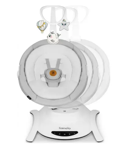 Toate setările produsului sunt stabilite de la panoul de control al ecranului tactil sau prin intermediul telecomenzii. Datorită funcționării silențioase a motorului, poți fi sigur că nu-ți va trezi copilul când va lua un pui de somn dulce. Acest model redă 12 melodii liniștite și o bentiță de jucărie - 3 în funcția rocker, 2 în funcția pat. Accesoriile exercită suplimentar concentrarea copilului, oferă noi stimuli și îl încurajează să-și întindă mâinile. Setul Rocker Lionelo Bella 2-în-1 este ușor și poate fi mutat și configurat cu ușurință oriunde. Tampoanele anti-alunecare vor proteja podeaua de zgârieturi. În caz de murdărie, cadrul poate fi șters cu o cârpă umedă, iar husa și husa saltelei pot fi spălate manual.