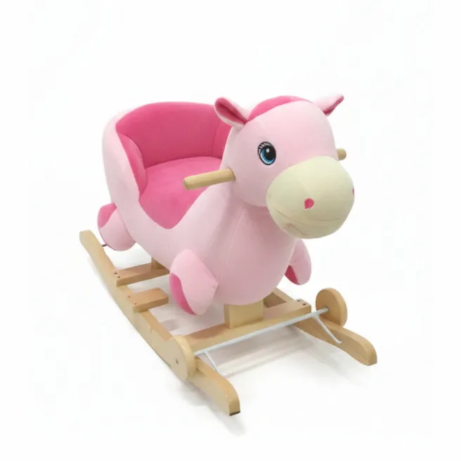 Acest cal de lemn va deveni un element frumos și îndrăgit în colecția de jucării a copilului dumneavoastră. Produsul este acoperit cu pluș moale, plăcut la atingere. Calul stimulează jocurile de rol, iar patinele stabile din lemn asigură o balansare sigură și lină.