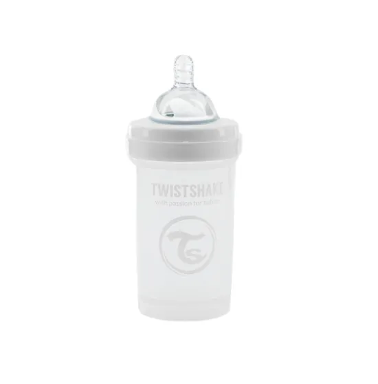 Biberonul Twistshake completează perfect alăptarea. Fiecare biberon include un recipient practic pentru laptele praf și o sită pentru omogenizare. Sistemul unic TwistFlow previne activ apariția colicilor și asigură un flux uniform. Biberonul are un gât larg, astfel încât este foarte ușor de curățat. Are un design ergonomic, ușor de ținut în mână și care menține căldura.