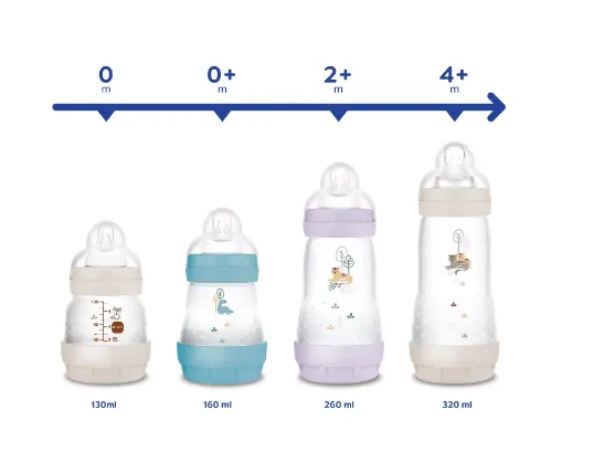 Atunci când folosesc biberonul MAM Anti-Colic, copiii trebuie să întrerupă băutul mult mai rar și astfel înghit mai puțin aer. Acest flux uniform de lichid ajută la reducerea simptomelor de colici.