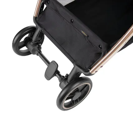 Roțile căruciorului JOY sunt echipate cu suspensie pentru tranziții line pe orice suprafață. Cele din față se rotesc la 360°, făcând căruciorul extrem de manevrabil.