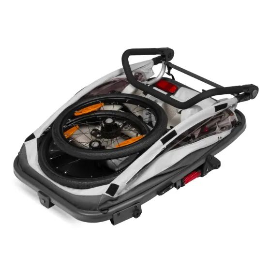Cama servește funcții duble atât ca remorcă pentru bicicletă, cât și ca cărucior versatil. Echipat cu două scaune, permite unui părinte să transporte doi copii simultan, dar funcționează eficient și atunci când se transportă un singur copil. Pentru a schimba funcția, pur și simplu detașați dîshlul pentru bicicletă și înlocuiți-l cu roata din față inclusă în set.