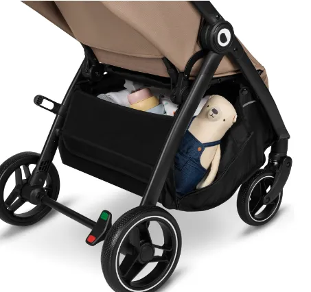 Oferă numeroase avantaje: este impermeabil, foarte spațios, iar fermoarele laterale permit accesul ușor la interior. Deoarece coșul este complet închis, căruciorul arată întotdeauna ordonat, iar obiectele din interior rămân ascunse.