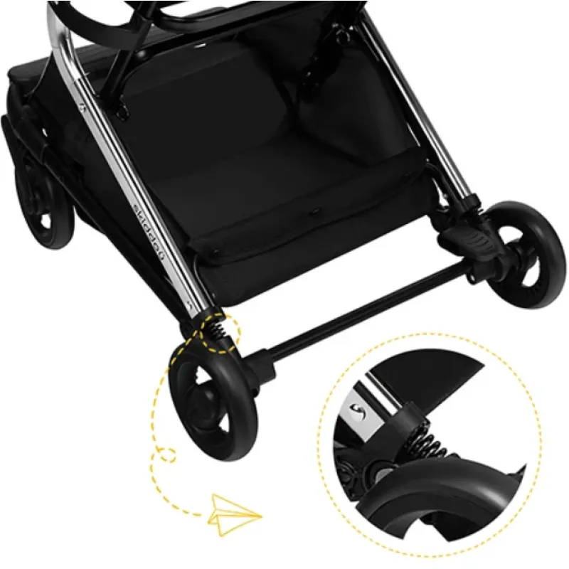 АмортизацияНаша коляска Mikkeli — это легкая коляска с хорошей амортизацией, которая обеспечивает комфорт при вождении. Отличается тем, что амортизация есть как на передних, так и на задних колесах.