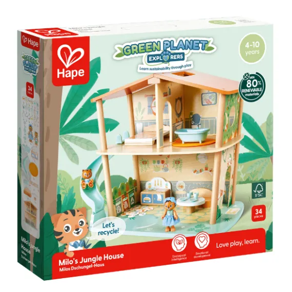 Casa, tigrii și accesoriile sunt fabricate din materiale durabile, regenerabile, cum ar fi lemnul certificat FSC și polietilena din trestie de zahăr. 18 carduri de gunoi vă vor ajuta să învețe copilul cum să sorteze gunoiul pentru reciclare, încurajând un stil de viață eco.