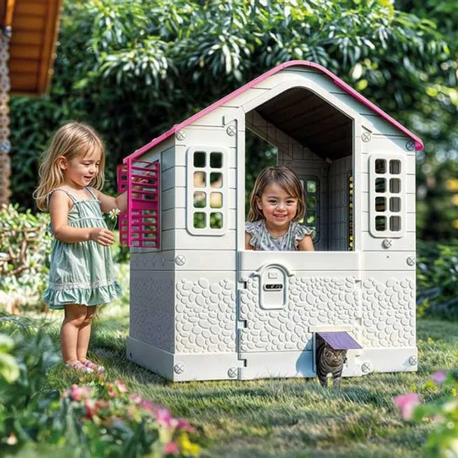 Încurajează jocurile de rol, stimulând comunicarea, imaginația și orientarea spațială, este fabricată din plastic de înaltă calitate, cu margini rotunjite pentru siguranța copiilor. Este dotată cu ferestre mari, care lasă să pătrundă lumina naturală, și cu două uși - una clasică pentru copii și una specială pentru animale de companie.