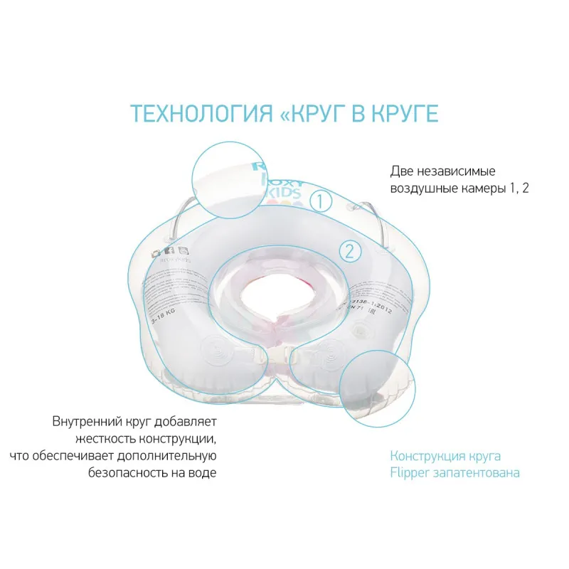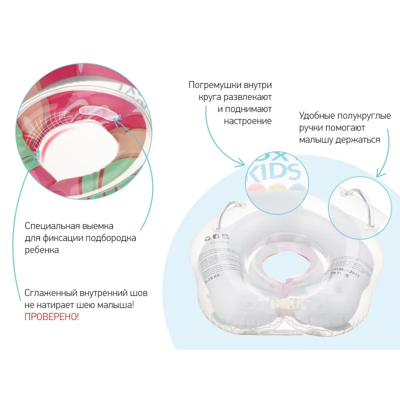 Accesoriul gonflabil pentru gatul bebelusului este realizat din polimer modern sigur si are, de asemenea, doua camere de aer, in interiorul carora se afla mingi de zornaie pentru o experienta de baie mai incitanta pentru bebelus.