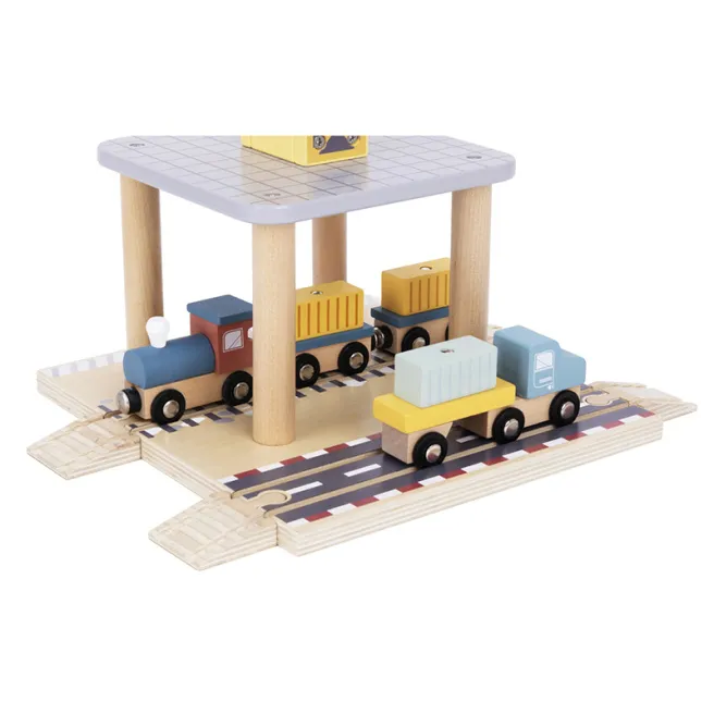 Această minunată jucărie din lemn are ca piesă centrală o minunată macara din lemn, pregătită pentru operațiunile de încărcare. Alături de macara sunt miniaturi ale unui tren, camion, șină, navă și containere de transport maritim, creând o scenă portuară captivantă pentru joc imaginativ.