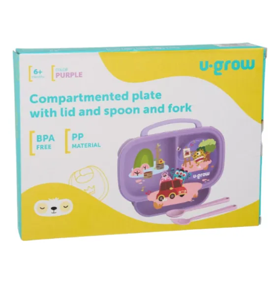 Farfuria are 2 compartimente, făcând posibilă depozitarea a 2 feluri de mâncare fără amestec. Poate fi folosită și pentru păstrarea mâncării copilului în frigider. Este deosebit de utilă în perioada diversificării alimentației. Setul include un bol care poate fi introdus într-unul dintre compartimente, o linguriță, o furculiță și un capac.