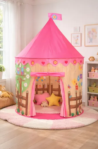 Fabricat din material durabil și ușor, cortul se montează și demontează simplu, iar cadrul stabil asigură siguranța copilului în timpul jocului.