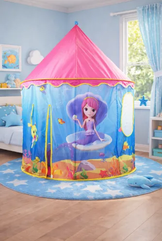 Designul viu colorat cu sirene și elemente subacvatice creează o atmosferă de basm, iar materialul durabil și cadrul stabil asigură siguranța în timpul utilizării. Cortul se montează ușor fără unelte și se potrivește minunat într‑o cameră de joacă sau dormitorul copilului.