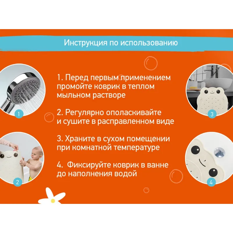 Suprafața covorașului are elemente de relief care asigură funcții de masaj, datorită cărora îmbăierea copilului va deveni nu numai simplă și sigură, ci și utilă.