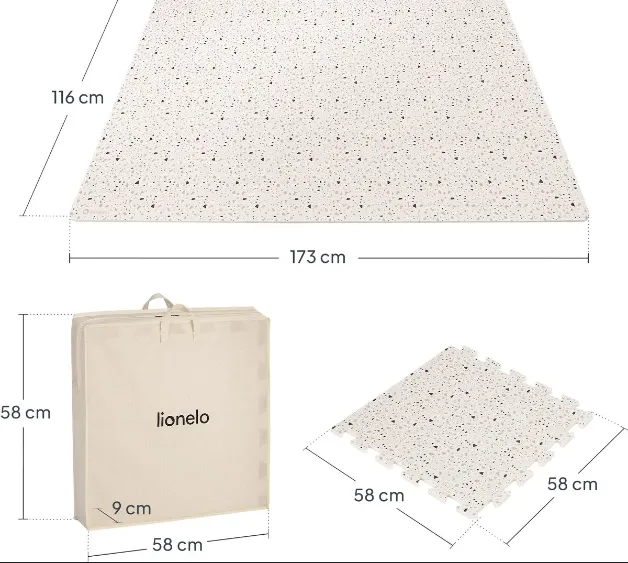 Covorașul de joacă Lionelo Yoka transformă orice podea într-un spațiu sigur, moale și confortabil pentru bebeluși încă din primele zile de viață. Setul este format din 6 plăci puzzle din spumă premium, cu design față-verso în nuanțe pastelate, oferind o suprafață generoasă pentru joacă, târâre și relaxare.