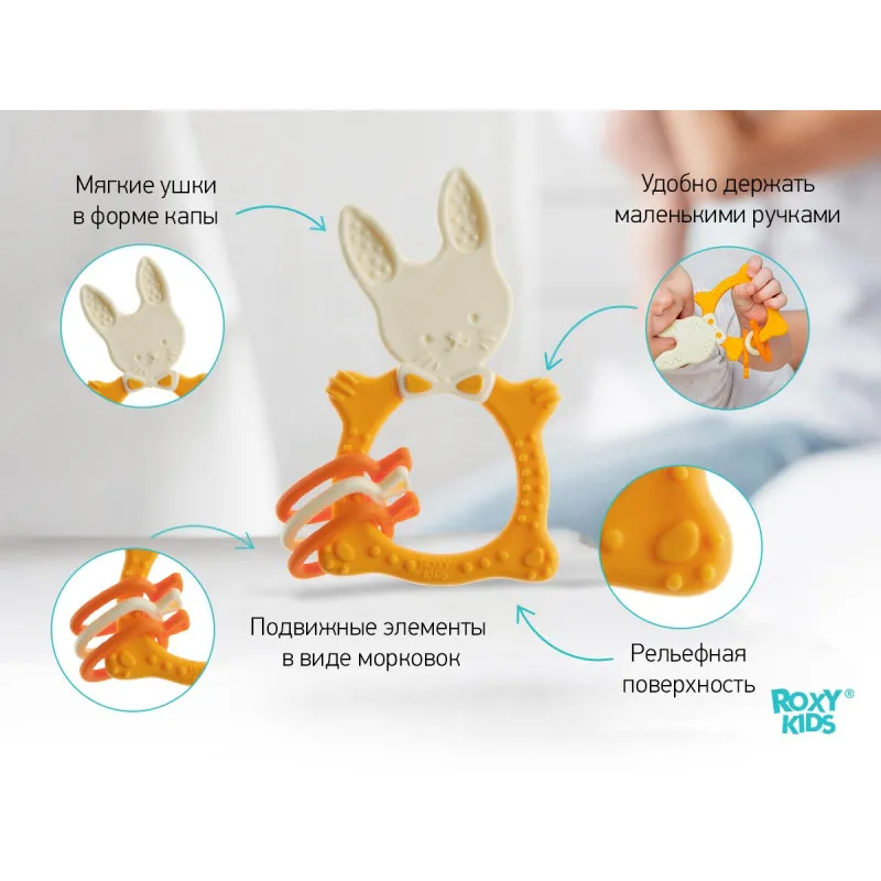 Teether BUNNY TEETHER de la ROXY-KIDS este potrivit pentru toate etapele de dentiție datorită elementelor de diferite grade de rigiditate.