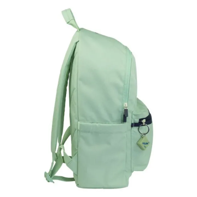 Rucsac urban clasic cu 2 fermoare. Seria 1918, culoare verde cu detalii bleumarin. Inspirat de culorile și designul originale ale radierelor MILAN, fabricate în Spania din 1918. Compartiment principal cu husă de protecție pentru laptop. Buzunar frontal și două buzunare laterale cu velcro cu acces rapid. Bretele reglabile, spate căptușit și respirabil. Buzunarul frontal include un inel de chei cu gumă de șters 430 pe mânerul cu fermoar. Captuseala interioara bleumarin imprimata cu o grila care evoca forma radierelor MILAN. Țesătură exterioară „Ripstop”: ușoară și rezistentă la coacere și rupere. Utilizează o tehnică specială care țese fire groase de armare la intervale regulate, creând un model încrucișat. Compoziția țesăturii: țesătură exterioară din poliester și căptușeală interioară. Dimensiune: 41 x 30 x 18 cm. Capacitate: 22 litri.