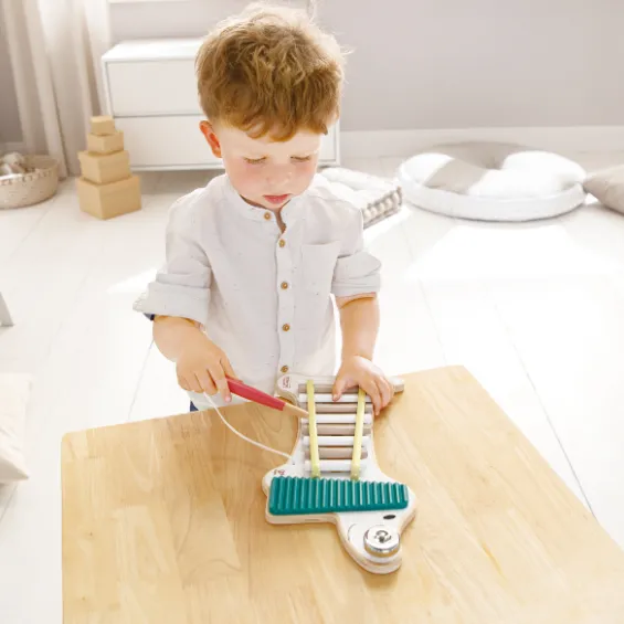 Adorabila cățelușă Xenia de la Hape nu este doar o jucărie, ci o prietenă muzicală specială pentru cei mici. Ea combină trei instrumente într-unul singur: xilofon, zornăitoare și un clopoțel pe năsuc. Copiii pot cânta la plăcile xilofonului cu bagheta, pot zgudui zornăitoarea sau pot face clopoțelul să sune, compunând primele lor melodii.