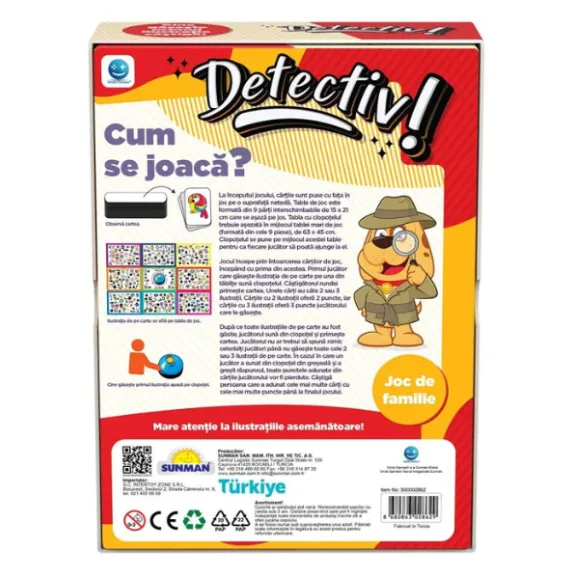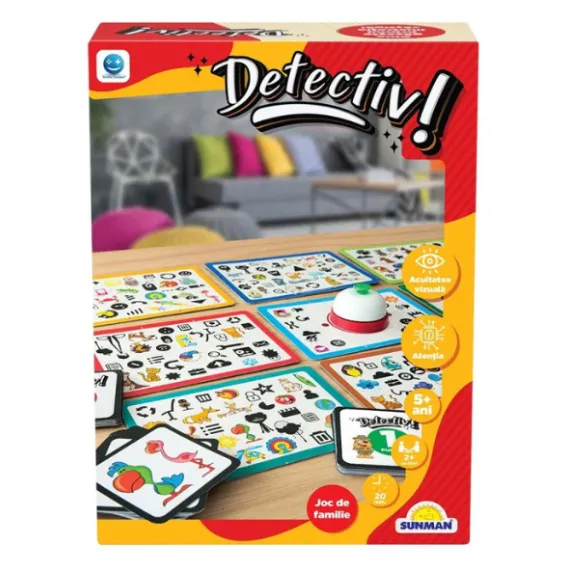 „Detectiv” este un joc de atenție și viteză, perfect pentru copii, care le testează abilitățile de observare și reacție rapidă! Fiecare jucător trebuie să fie atent și să identifice cele mai rapide ilustrații pe tablă, pentru a câștiga puncte și a ajunge la titlul de „Detectivul” cel mai bun!