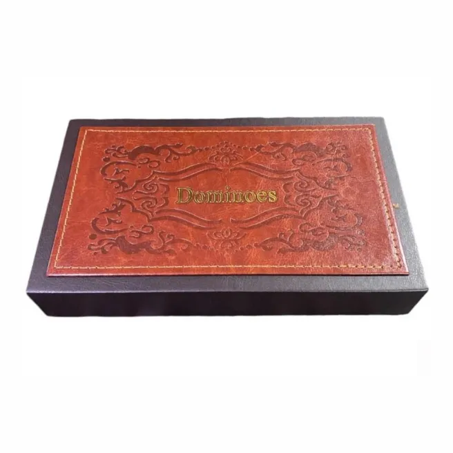 Setul clasic de domino este prezentat într-o versiune rafinată, în care calitatea tradițională se îmbină cu stilul modern. Piesele cu marcaje contrastante clare sunt așezate într-o cutie decorată cu un model elegant de culoare maro. Designul ambalajului este realizat în stil minimalist, fără inscripții și detalii inutile, ceea ce transformă jocul într-un element stilat de interior.