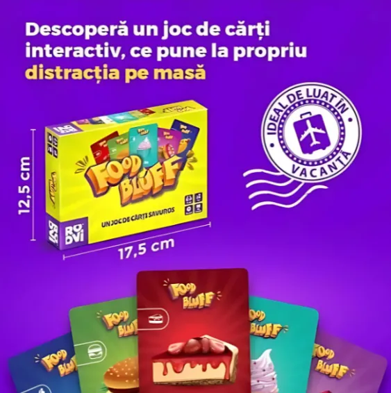 Intră în lumea savuroasă a jocului Food Bluff, un joc de cărți interactiv și distractiv care face ca întâlnirile în familie sau cu prietenii să fie de neuitat. În Food Bluff, controlul emoțiilor este esențial. Așadar, stăpânește-te, demască-i pe cei care bluffează din jurul tău și bucură-te de o porție zdravănă de distracție împreună cu cei dragi.