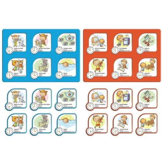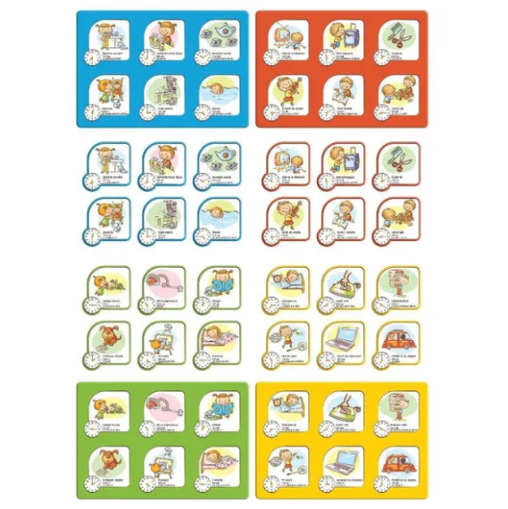 Alege o planșă și completează casetele ilustrate cu cartonasele corespunzătoare, pe care sunt reprezentate aceleași ore și activități. Fiecare jucător trebuie să găsească cartonasele corecte și să le așeze în dreptul orei și activității potrivite. Primul jucător care își completează planșa câștigă!