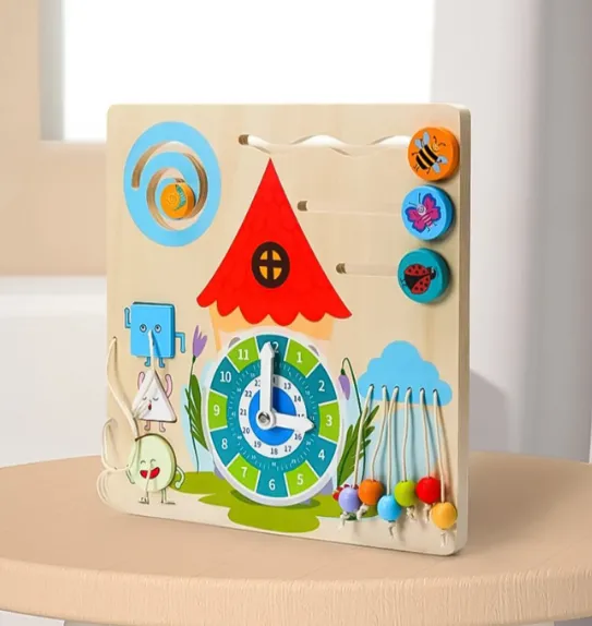 Jucându-se, copilașul tău apucă, deschide/ închide ușile și încuietoarele, rotește fidget-ul, aprinde luminițele, scoate sunete la claxon și la xilofon, desprinde magneții de la formele geometrice , desface fermoare, se privește în oglindă, simte diferite texturi, urmărește cifre, numără mărgeluțe, înoadă fundițe etc.
