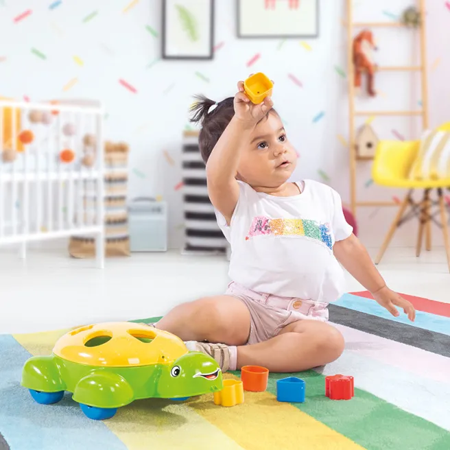 Broscuță țestoasă are carapace cu sortator pentru forme, perfectă pentru dezvoltarea îndemânarii și pentru descoperirea formelor și a culorilor.