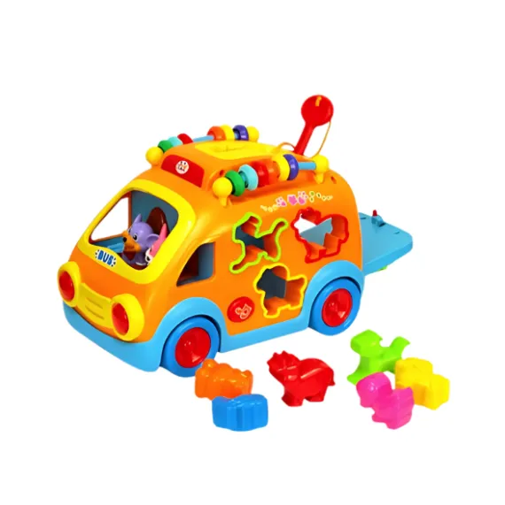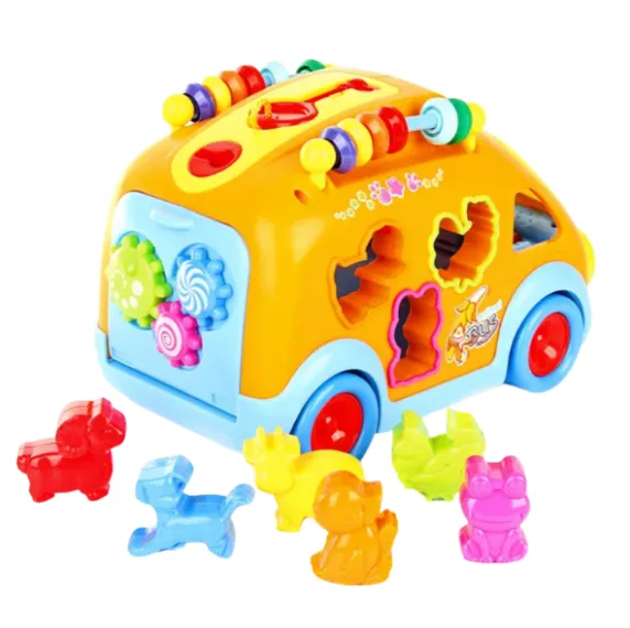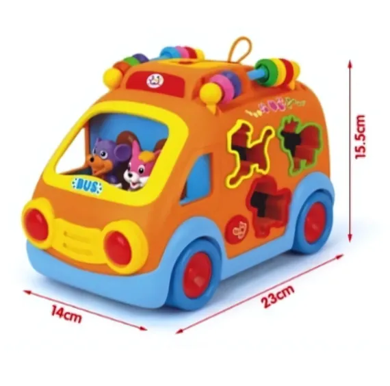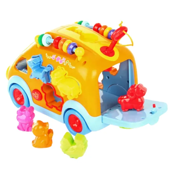 Sortator: Autobuzul este echipat cu orificii de diferite forme pe laterale, unde copilul trebuie să introducă figurinele corespunzătoare ale animalelor. La plasarea corectă a figurinei, se aude sunetul specific animalului, facilitând învățarea și recunoașterea sunetelor.