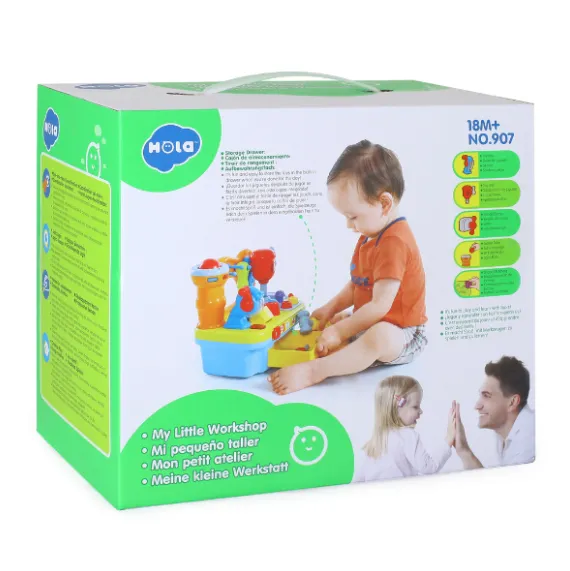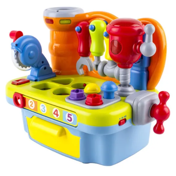 Activități de învățare distractive: Include o mulțime de activități educative pentru cei mici, cum ar fi numărarea de la 1 la 5. Selectați un număr pentru a-l auzi și o melodie amuzantă pentru copii. Include un joc de sortare a formelor: pătrat, triunghi, inimă și cerc. Trei instrumente separate, ferăstrău și burghiu de jucărie, trompetă muzicală.