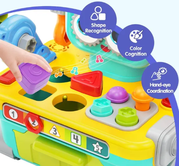 Sorter de forme, luminile puternice și muzica distractivă încurajează învățarea alfabetului, a formelor și a culorilor.
