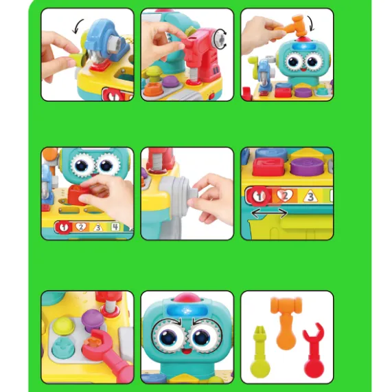 Burghiu electric, drujbă, menghină, ciocan, șurubelniță, cheie, tub de joacă cu bile, riglă cu numere, angrenaje și șuruburi.