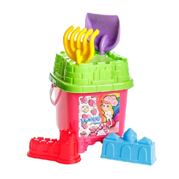 Setul include: găleată, capac – sită în formă de castel, lopată, greblă și forme pentru nisip în formă de castel